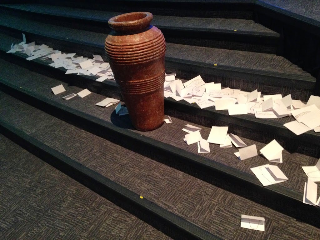 (Closing exercise – sheet of paper with water jar outline on it; write a shame, take it up to altar, and leave it behind.)