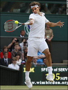 3. Roger Federer's Forehand. It starts out looking like a throwback Eastern grip, closed-stance forehand. Midway through it transforms into a semi-Western grip blur. By the end time he's finished with his thoroughly modern follow through, the ball is by you with impossible speed and improbable angles. I still can't figure out how he does it. But he does.