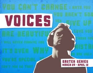 Voices. An Easter series. Starts March 29. 8:30. 10:00. 11:30.