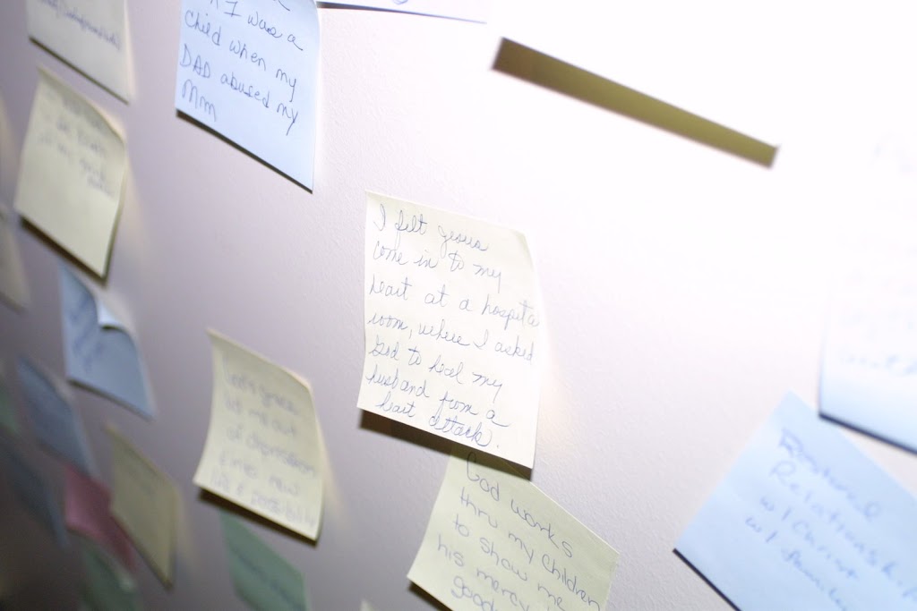 As a response, we invited the people to write down God's interventions on post-it notes (we put three in every bulletin!) and then post the notes on the walls of the Worship Center.